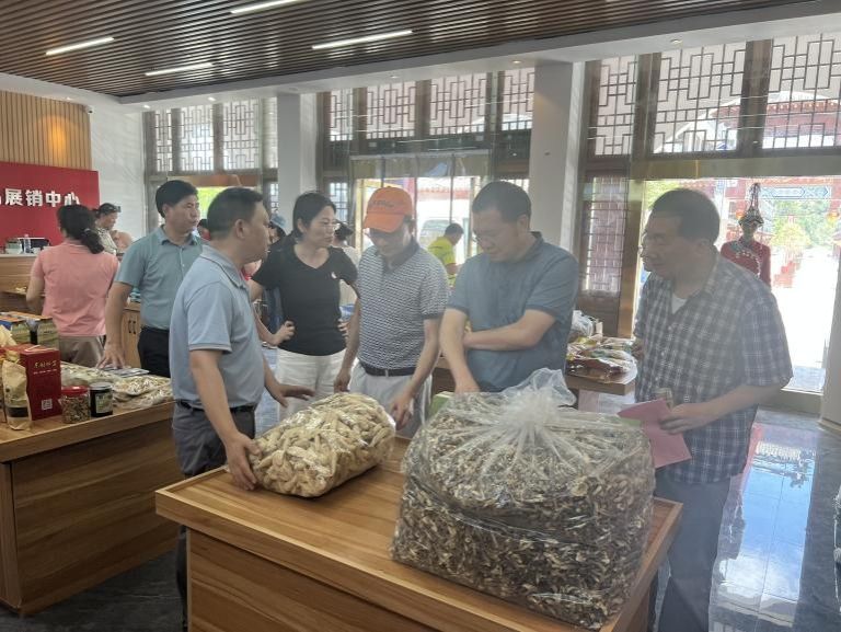 活动结束后,民盟中国计量大学委员会又与永丰县民盟总支进行了精准对接,在县政府副县长汤武妍、县统战部常务副部长杨智坚、龙岗畲族党委书记曾永平、永丰县民盟副主委黄丽陪同下,实地考察了永丰县龙岗畲族乡农的农副产品展销中心,并现场观摩了在线直播平台推送的畲族特色产品黄元米果。
