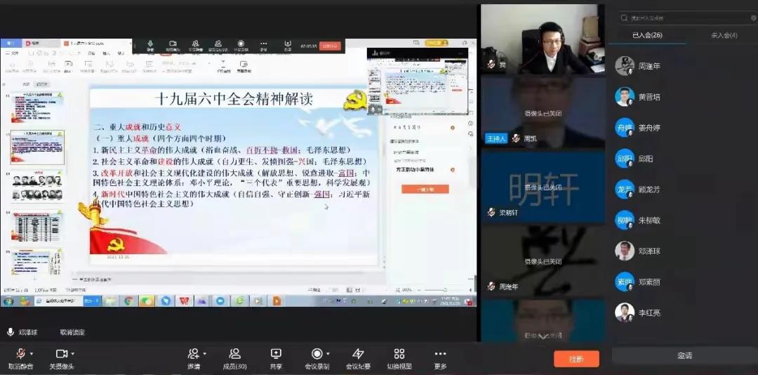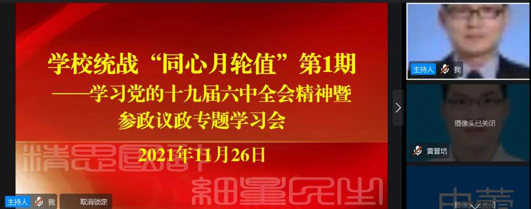 为有效提升学校统战工作质量,筑牢共同团结奋斗的思想政治基础,11月26日上午,学校统战“同心月轮值”第1期——学习党的十九届六中全会精神暨参政议政专题学习会在线举行,各民主党派、统战团体、党外“青苗计划”教师共计30人参加会议,会议由本期轮值主席校民盟主委周浩淼教授主持。