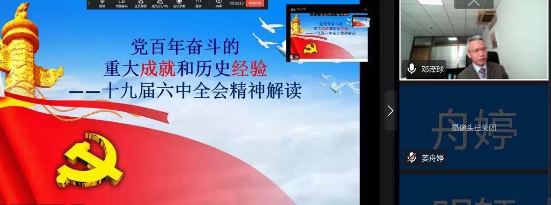 马克思主义学院邓泽球教授主讲《党百年奋斗的重大成就和历史经验——十九届六中全会精神解读》,他围绕决议内容、重大意义、历史经验等全方位深刻阐述了党的百年奋斗历程、全会的精神内涵以及统一战线在党的历史上的重要法宝作用。