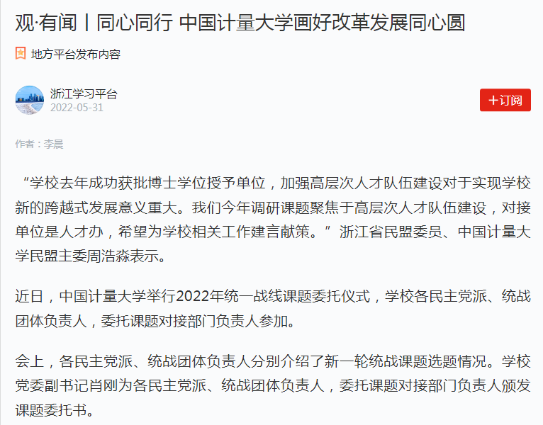 “学校去年成功获批博士学位授予单位,加强高层次人才队伍建设对于实现学校新的跨越式发展意义重大。我们今年调研课题聚焦于高层次人才队伍建设,对接单位是人才办,希望为学校相关工作建言献策。”浙江省民盟委员、中国计量大学民盟主委周浩淼表示。